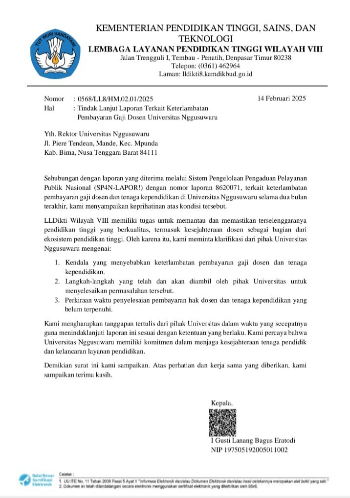 Perwakilan dosen melaporkan situasi tersebut ke LLDIKTI Wilayah VIII. LLDIKTI merespons melalui surat nomor 0568/LL8/HM.02.01/2025 tertanggal 14 Januari 2025. Dalam surat tersebut diminta pihak UNSWA untuk: