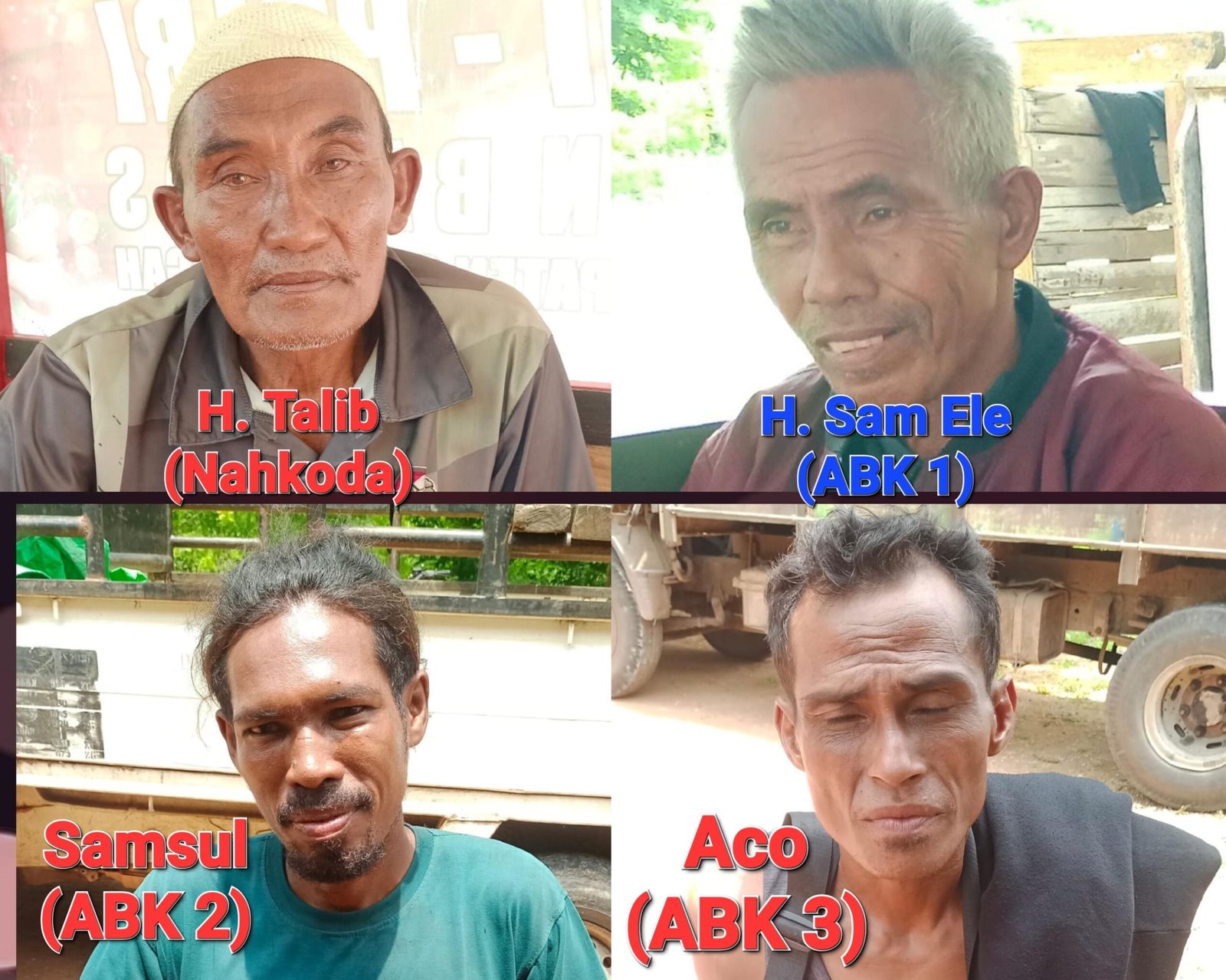 Kapal akhirnya tenggelam sekitar pukul 04.00 WITA di perairan dekat Pantai Wewawi. Nahkoda Haji Talib (50) bersama tiga ABK — Haji Sam Ele (55), Samsul (34), dan Aco alias Pua Nurdin (36) — menyelamatkan diri menggunakan jerigen sebagai alat pelampung dan berhasil mencapai pantai sekitar pukul 05.00 WITA.